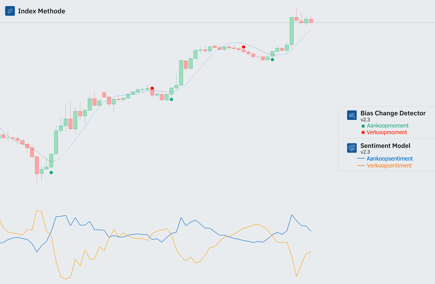Daar komt het Sentiment Model bij: deze datastroom onder de grafiek laat zien wat de huidige marktomstandigheden zijn en in welke richting de bredere trend beweegt.